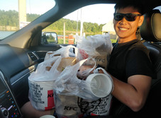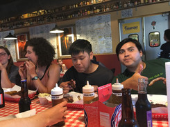 Heavily involved with ESP (Educational Studies Program) at MIT, Evan is passionate about teaching and is very good at it. He's also passionate about food - just look how happy he is to be holding such a large quantity of KFC! His true food affair, however, is with BBQ. He's pictured here contemplating a rib at Pappy's Smokehouse in St. Louis, firmly in his happy place. Lastly you see him in a quiet moment of contemplation, a modified "Thinker" pose with his fist halfway in his mouth. I believe he's trying to fit the whole thing in, but in any case it says a lot about Evan as a person.